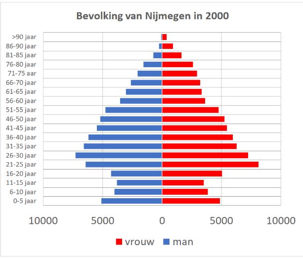 Sommige zaken zijn rechtstreeks uit de plaatjes af te leiden. Neem nu de veranderingen in de vorm van de piramide. In 1900 leek de bevolkingsopbouw inderdaad nog op een piramide. Er werden veel kinderen geboren, maar je ziet ook dat de groep van 6-10 jaar meteen een stuk kleiner is door de zuigelingen- en kindersterfte. Voor de negentiende eeuw gold dat een zuigeling in Nijmegen 25% kans had vóór de eerste verjaardag te overlijden en 40% voor zijn vijftiende. Onvoorstelbaar in onze tijd.