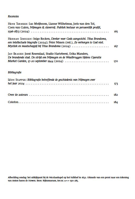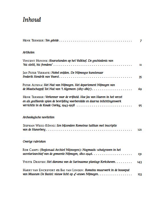 Verbindingen uit een recenter verleden, zoals het veer tussen Nijmegen en Lent en de spoorlijn naar Kleef, waren ooit van grote betekenis, maar zijn ingehaald door de tijd. Plannen voor andere verbindingen, in de vorm van een luchthaven en een kabeltram over stad en rivier, zijn wel ontwikkeld maar nooit gerealiseerd.. Alphons Siebers kreeg in1934 eerst steun voor het uitgebreide groensysteem in zijn uitbreidingsplan voor Nijmegen, maar moest in de jaren daarna toezien hoe dat onder politieke druk drastisch werd uitgekleed. Veranderingen in de mobiliteit leidden in de vorige eeuw voortdurend tot nieuwe verkeersmaatregelen, zoals de introductie van het stoplicht. ze zijn vastgelegd in beleidsstukken en krantenberichten, maar vooral ook in foto’s en filmbeelden. In de rubrieken is er verder aandacht voor de opzienbarende romeinse graven onder het plaveisel van de Nijmeegse Burchtstraat en voor enkele bijzondere aanwinsten van het Valkhof Museum. Het jaarboek sluit af met enkele recensies en de jaarlijkse bibliografie over de geschiedenis van Nijmegen.
